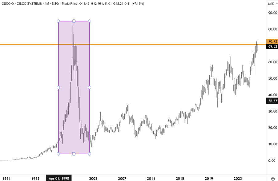 For example, many companies like Cisco (one of the dotcom leaders) fell by the wayside and underperformed for decades. It has taken 25 years for Cisco to fully recover from the dotcom crash – and the shares are still below the 1999 highs.