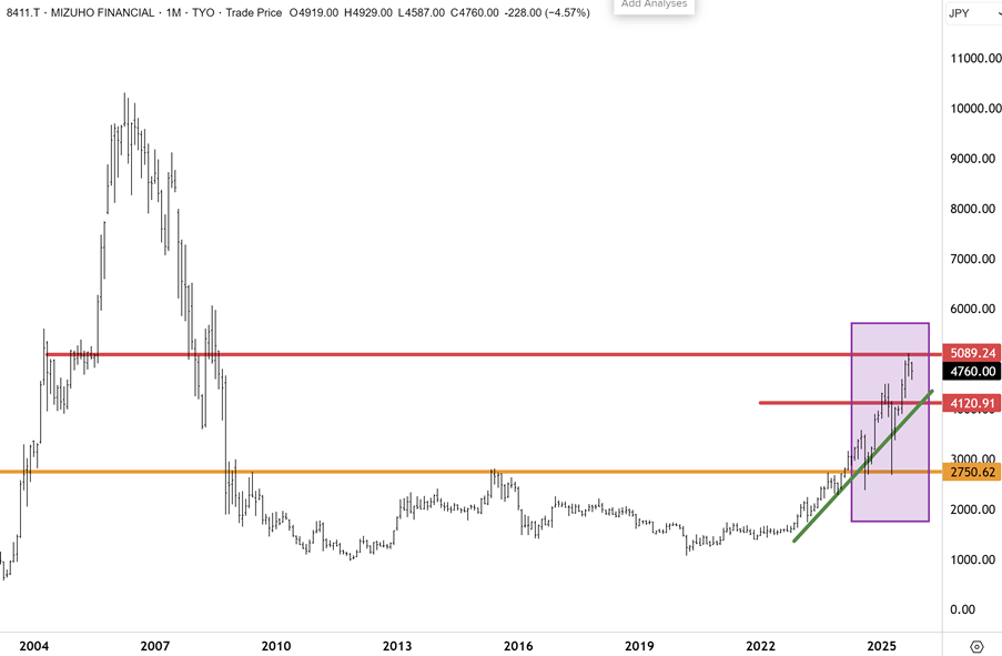 Mizuho has aggressively ramped up its share buyback initiatives in recent years as part of a dual strategy to optimise capital efficiency but also enhance shareholder value. The group’s most substantial buyback occurred in May 2025, where 40 million shares were authorised to be bought back, which is approximately 1.6% of outstanding shares, for around $1 billion. These buybacks are likely to continue. Amongst other Japanese banks we hold, Mizuho is one I would consider in the event of a market pullback – along with other majors, including Sumitomo Mitsui Financial Group and Mitsubishi UFJ, along with some of the regionals.