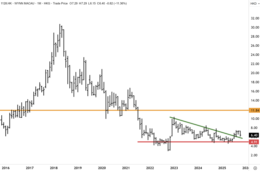 Wynn Macau was dragged down in the China/Hong Kong bear market, which endured for five years, and was very severe. The shares have now bottomed out in my view and are close to confirming an important inflection. Looking past any weakness over the coming weeks and months, the recovery potential for Wynn Macau is significant in my view. Macau is not just about gambling; it is China’s preeminent entertainment precinct, and it attracts tourists from the mainland and abroad.