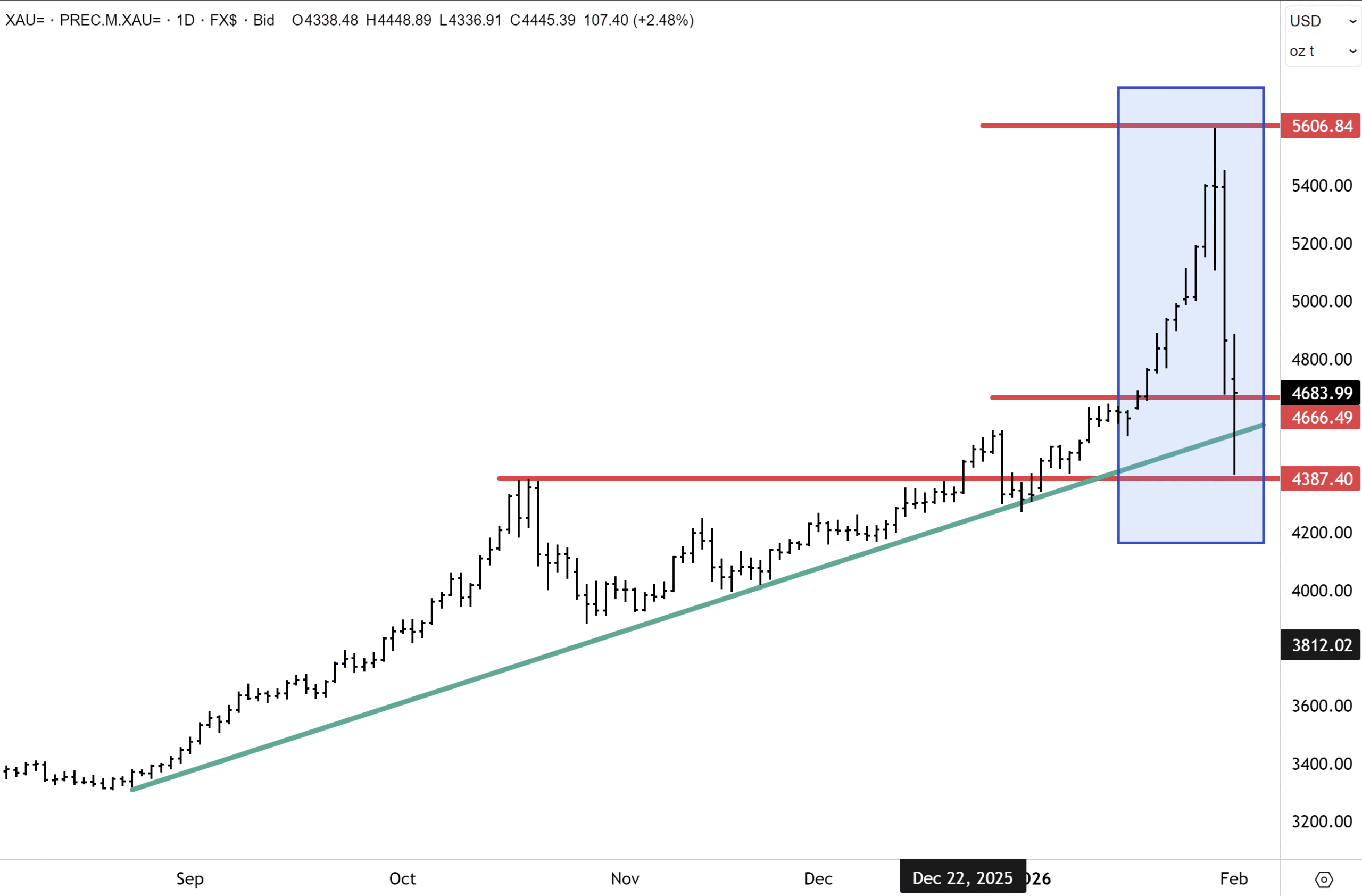 Technically, the gold showed encouraging signs of stabilising on Monday. After touching an intraday low of $4,387, gold rebounded off the October highs and staged a sharp upward reversal, rising quickly back to $4,700oz at the time of writing. This upward dynamic was a positive outcome and points to the acute selling and drawdown that got underway on Friday, losing momentum. I expect prices to begin settling down now and for gold to enter a multi-month consolidation – similar to what occurred following the October drawdown last year in a range between $5,000 on the topside with the $4,600 and $4,500 levels as key supports. After the dust settles, gold will resume upward momentum in my opinion and likely retake the $5,000 level later this year. Our outlook might be conservative! What resonated this week was JP Morgan lifting their price target to $6,300 for December ’26!