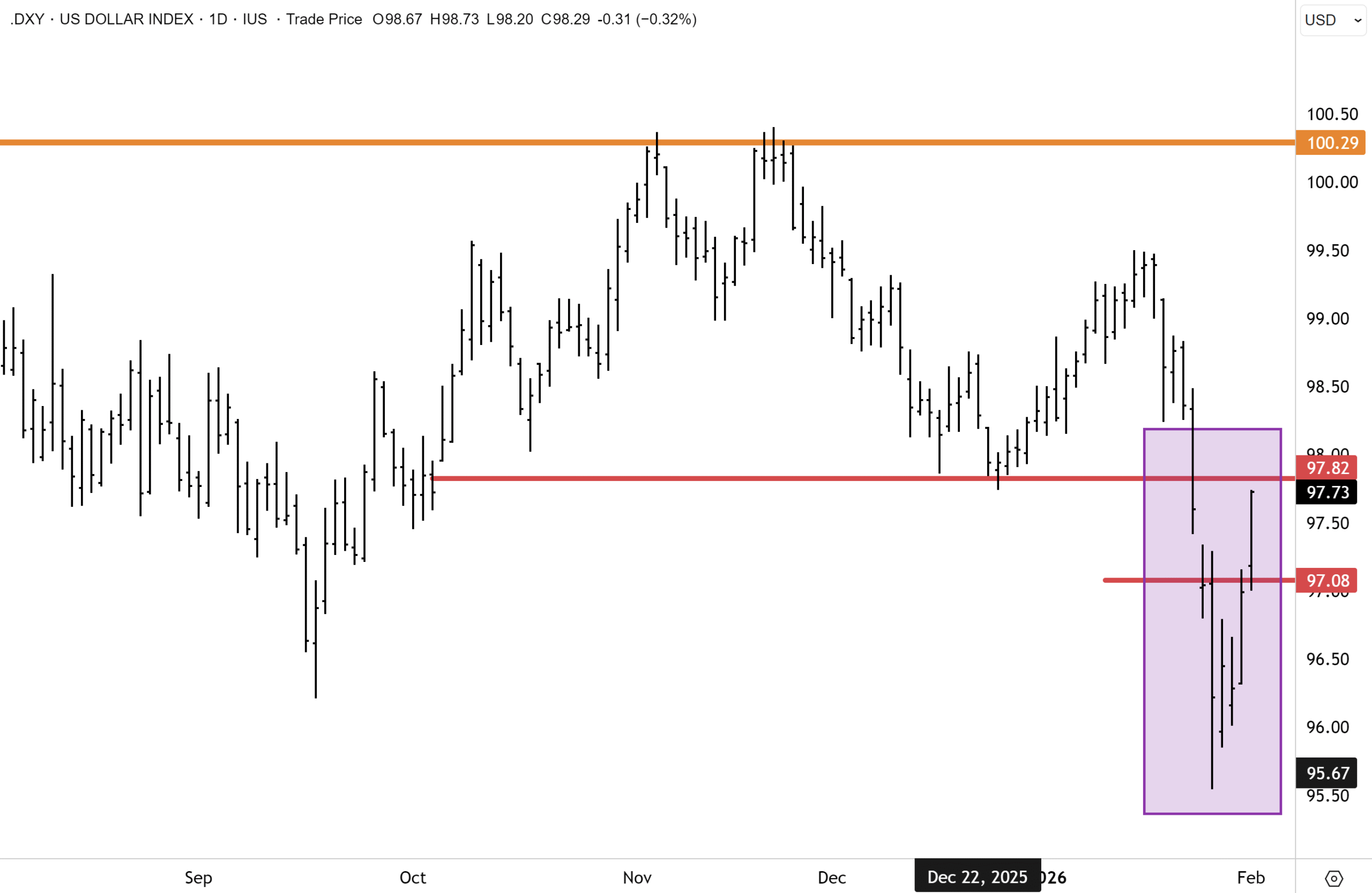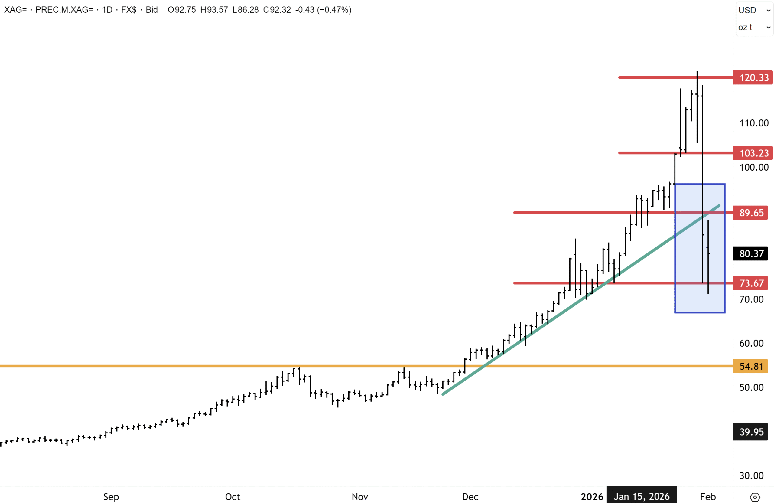 For silver, the Friday drawdown was not unexpected, but we concede the technical setup on the charts is messier than gold. With silver spot prices overshooting to $120oz, the spike higher had all the hallmarks of a short-term squeeze in the physical market and heavy speculation in futures. I expect silver to now settle down and enter a multi-month consolidation phase and establish a new range with the $65/$70 a potential support floor and the $90 level on the topside, a likely short to medium term cap.