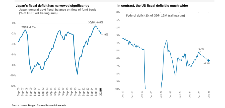 Japanese equities have reached record highs in early 2026, yet the momentum appears far from exhausted as the country emerges from three decades of deflation through a fundamental transformation in both fiscal policy and corporate behaviour. Contrary to widespread concerns about Japan’s elevated debt-to-GDP ratio, the underlying fiscal reality is robust. The deficit has narrowed to just -0.5% of GDP, the healthiest gap in close to thirty years and starkly superior to the approximately 6% federal deficit in the United States. For the first time in decades, Japan’s nominal GDP is growing faster than its debt issuance, causing the debt-to-GDP ratio to actually decline through the “denominator effect.”