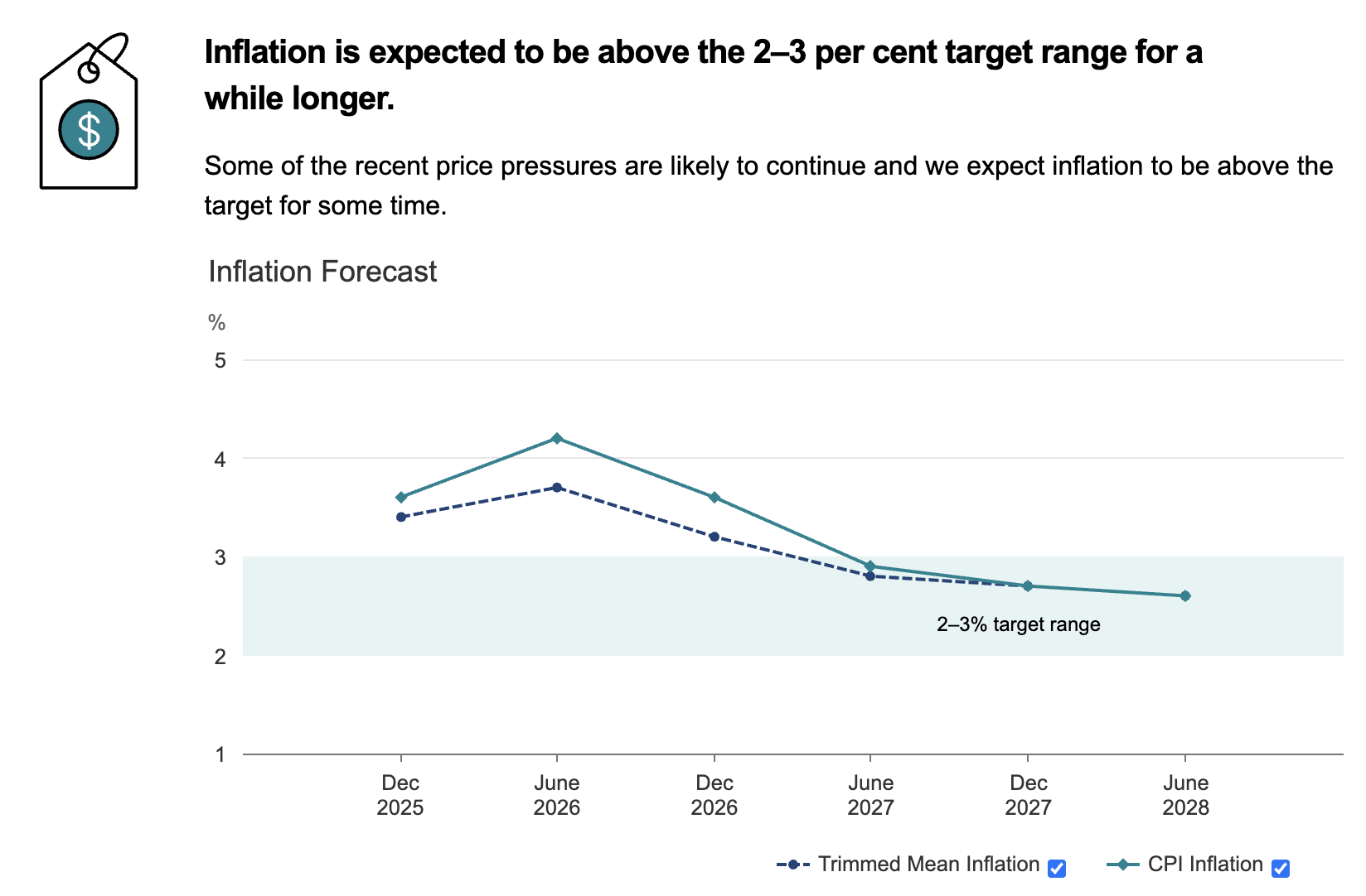 The RBA upgraded its inflation forecasts to be ‘materially higher,’ with the consumer price index now expected to rise above 4% by mid-year. It now expects trimmed mean inflation (the key figure to watch) to be 3.7% by June, up from a previous 3.2%, and 3.2% by December rather than 2.7%, with inflation not expected to return to the midpoint of the 2%–3% target band until mid-2028. If we don’t see some improvement in the coming months, this implies that at least one more rate rise is likely.