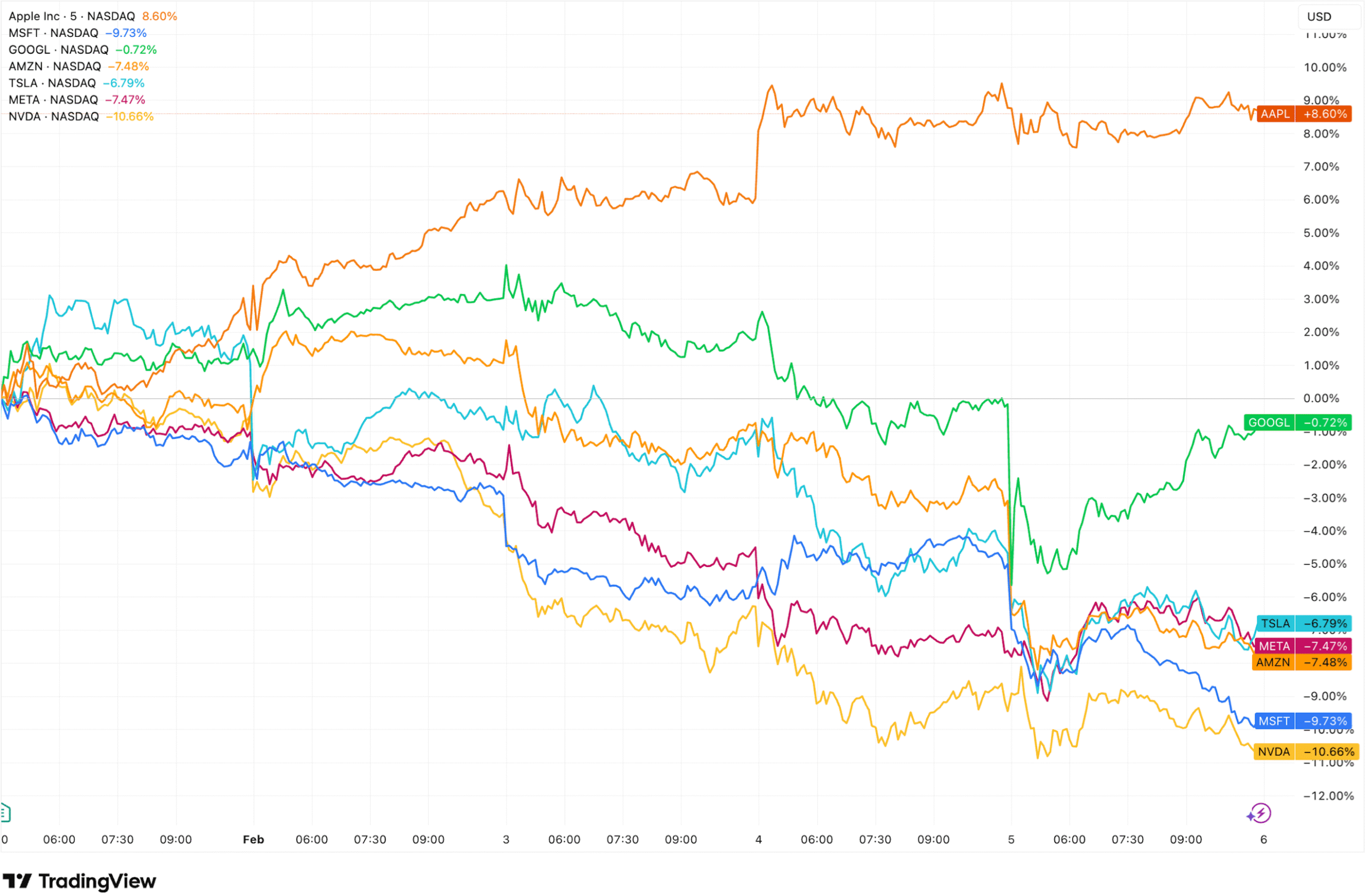 Amazon’s quarterly results were otherwise close to forecasts. Revenue beat expectations, while earnings per share came in slightly light. AWS and advertising revenue each topped Street expectations, and net income rose from a year earlier. Shifting investor appetite towards AI over the past week (5 trading days) can be clearly seen below, as investors snapped up Apple and rotated from Nvidia and others. Our research has updated Apple – see a snapshot below and the full report in our Members area.