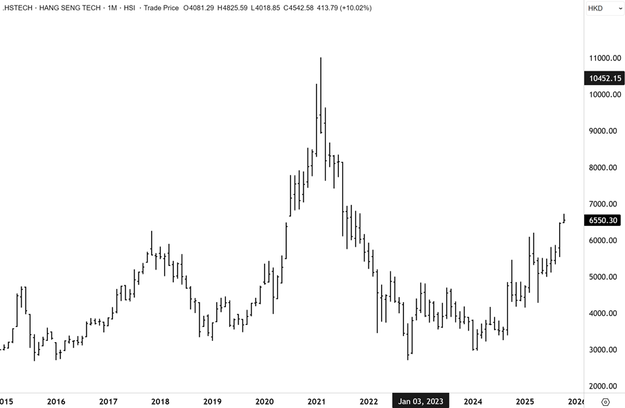 Back in 1999, companies were floated with no earnings. New equity was raised at nosebleed prices, that drove the bubble higher. But I have a sharp preference for Chinese AI and technology companies – which have much lower valuations and are still well down from record highs four years ago. Chinese equities have only recently exited a severe bear market – so I see a comparatively favourable risk/reward skew.