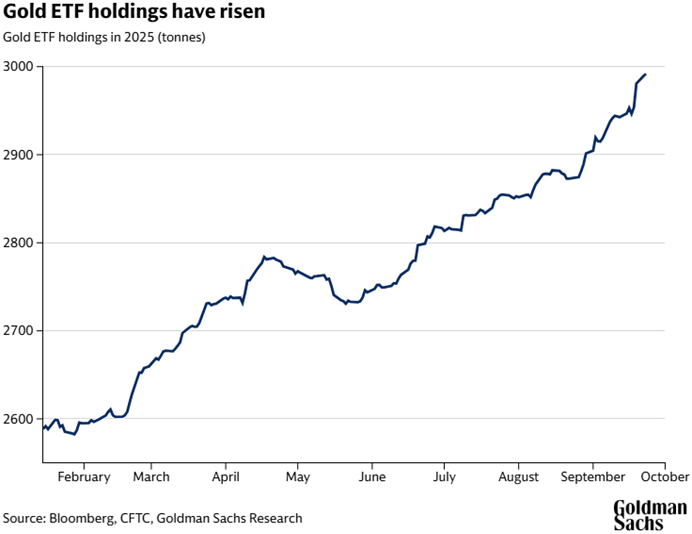 Goldman expects central bank buying to average 80 metric tons in 2025 and 70 tons in 2026, saying emerging market central banks are likely to continue the structural diversification of their reserves into gold. Western ETF holdings are expected to rise as the US Federal Reserve is seen lowering the funds rate by 100 bps by mid-2026. In contrast, noisier speculative positioning has remained broadly stable. Following the large September increase, the level of Western ETF holdings has now fully caught up with our US rates-implied estimate, suggesting the recent ETF strength is not an overshoot.”