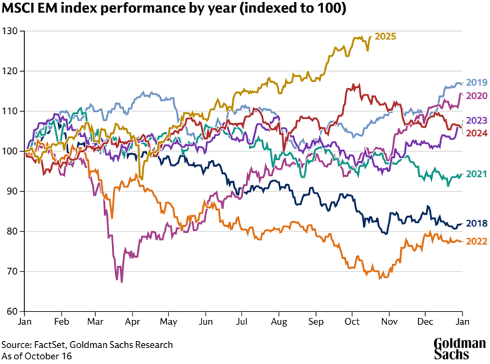 Goldman emphasised that “Chinese and South Korean equities—which have already performed well in 2025—are particularly well-positioned for growth, as both markets offer exposure to the AI/tech theme. Ongoing reforms to the way companies are governed in South Korea could also drive up stocks, as could Chinese efforts to address disorderly price cutting and excessive competition among producers.”