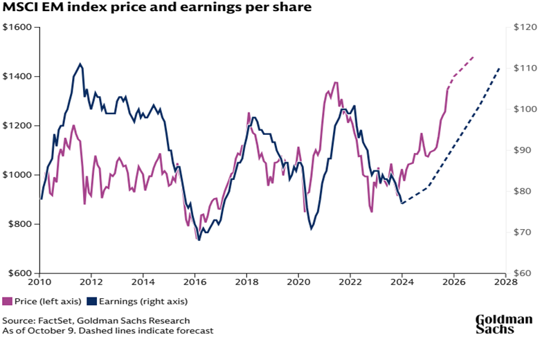 But according to a weekend update from Goldman Sachs, “emerging market (EMs) equities are expected to rally over the next 12 months, driven by earnings upgrades, demand for geographical diversification, and anticipated interest rate cuts from the Fed, along with a weaker dollar.” This has been my view for some time, and the outperformance we have seen in key EMs, including China/Hong Kong, could continue well into next year as a new early-stage bull market gets underway.