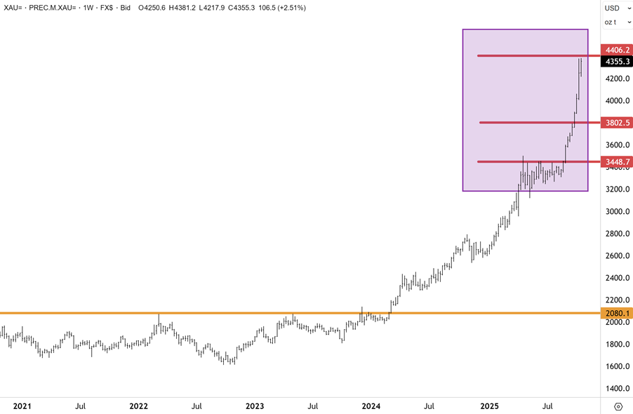 Gold has incurred a steep reversal after encountering heavy overhead resistance at $4,400oz. The acute phase of the correction is now underway, and near-term volatility is going to be high in the coming days and skewed to the downside. Key supports reside at $4000oz, $3800oz and $3,500. Once the acute phase of the volatility has cleared (likely in the coming weeks), I would expect gold to find support at one of the key supports highlighted above and then consolidate for a period, much akin to the phase we saw play out following the April spike. The bottom line is that, near-term correction risks aside, gold’s bull market is not over in my view, and has potentially years to fully play out.