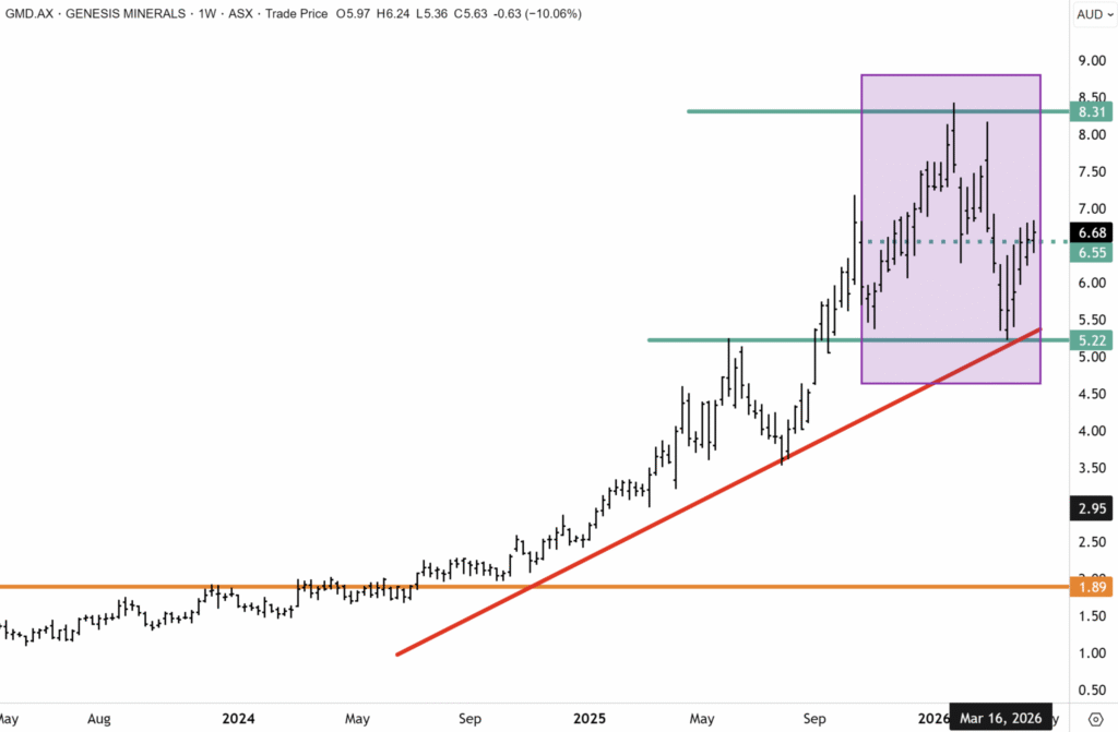 Since our last technical update on Genesis Minerals, the shares endured a sharp drawdown in March along with the gold price and the global gold mining sector. GMD put in an important low of $5.20 at the primary uptrend during the steep March correction after hitting a record high above $8.30. GMD has since rebounded to hurdle resistance around $6.50. We have conviction that GMD’s correction is now over and that upward momentum is now resuming. GMD could quickly retest the record highs in our view, should spot gold advance back above US$5000/oz.