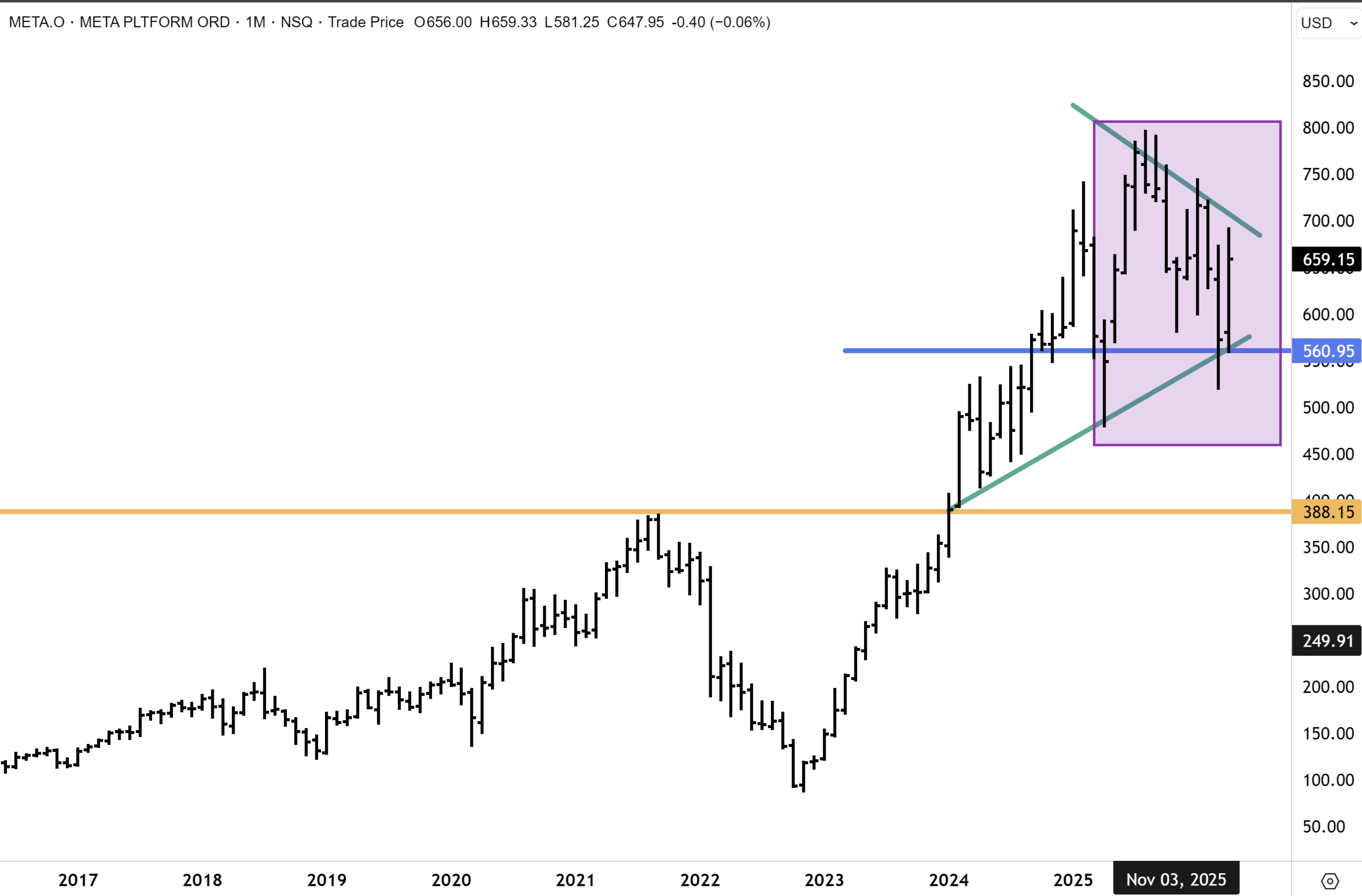 Meta Platforms has resumed upward momentum but remains within its trading range. A topside breakout above resistance at $660 could see the record highs around $800 quickly retested if Wall Street endorses the earnings result and the AI investment narrative.