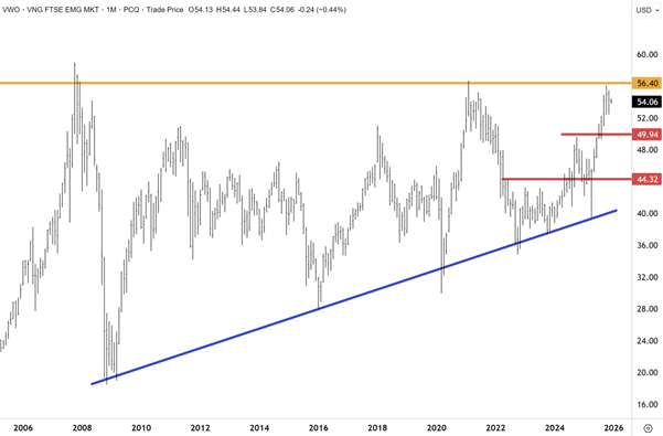 I anticipate a topside breakout in the Vanguard FTSE Emerging Markets ETF (US: VWO) above 56 within the coming months – and for a new bull market in EMs to ensue. China/Hong Kong will likely be at the epicentre of this move, but many other markets could soon follow.