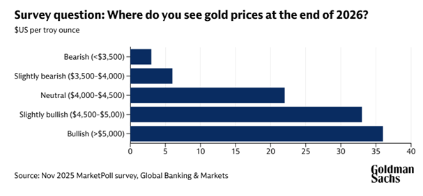 Goldman Sachs, in a weekend note to investors, said that institutional investors are becoming more bullish on gold stocks. The investment bank noted that “prices for gold has hit record highs this year, driven in part by surging central bank buying. Almost 70% of institutional investors expect gold prices to rise further by the end of 2026, according to a poll of more than 900 clients on Goldman Sachs’ Marquee platform conducted from November 12-14.The largest proportion of respondents – 36% – think gold will exceed $5,000oz by the end of next year (gold traded at $4,158 on November 27).” Normally, this survey would make me highly nervous. However, notwithstanding what is happening at a high level in terms of global macroeconomic conditions, gold rising above $5000 makes sense given that there are few alternative ways to hedge.