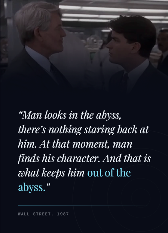 “One scene from the 1987 film Wall Street always comes to mind during these times. An old timer in the firm says to Bud Fox, just before the police arrive to end his career: “Man looks in the abyss, there’s nothing staring back at him. At that moment, man finds his character. And that is what keeps him out of the abyss.”
