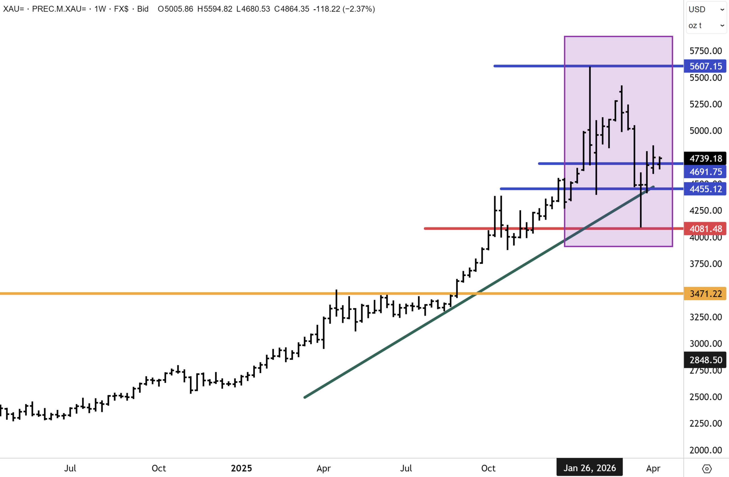 Gold has managed to resume upward momentum and regain the $4,700 level. We have confidence that our target of $5,000 will be eclipsed once again this year, and while it could take some time for the record highs at $5,600 (established on Comex) to be retested, the bull market remains very much intact in our view.