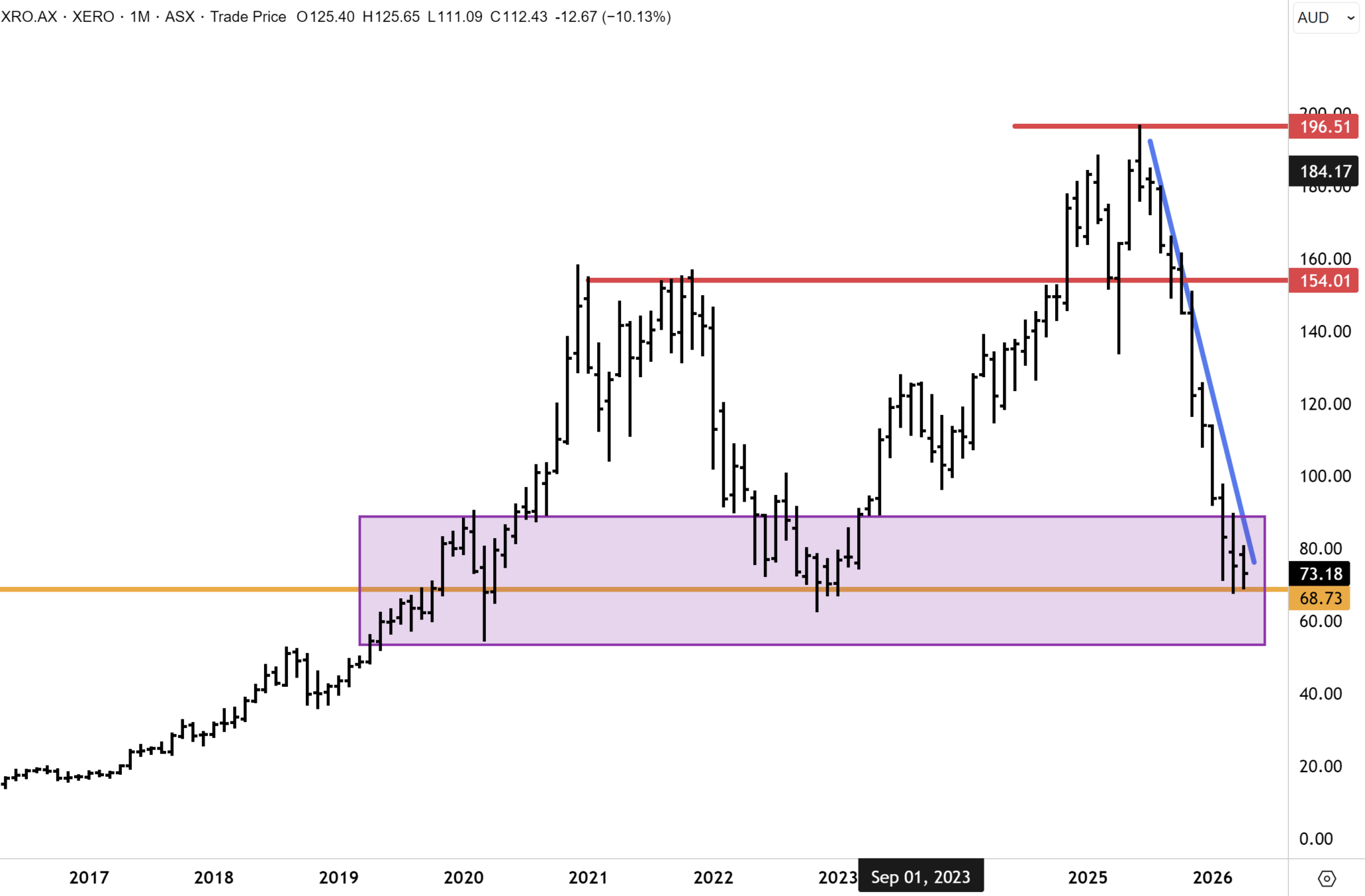 Xero is a stock that looks to have confirmed an important bottom. The shares have fallen from highs around $200 to find support around $70, which are major levels that were tested back in 2022 and 2020. Our technical base case is that a breakout above $75 will soon ensue, and upward momentum returns when risk appetite for Australian technology companies returns. Once the downtrend is breached (on the upside), we believe Xero would have recovery potential initially towards $100/$120, but plausibly the record highs over a medium-term time frame.