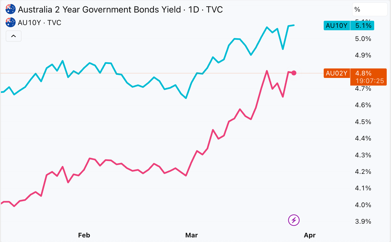 When local inflation data dropped on Wednesday (before Kent’s speech), it supported market sentiment, and rate rise expectations for May softened. February CPI eased to 3.7%, a tick below the 3.8% forecast (trimmed mean came in at 3.3% vs the 3.4% expected), but predated the conflict’s energy price shock.