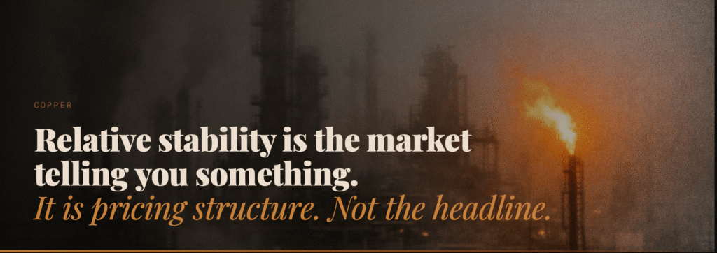 • Copper held stable around US$5.50/lb. The market is increasingly pricing structural demand over geopolitical noise.