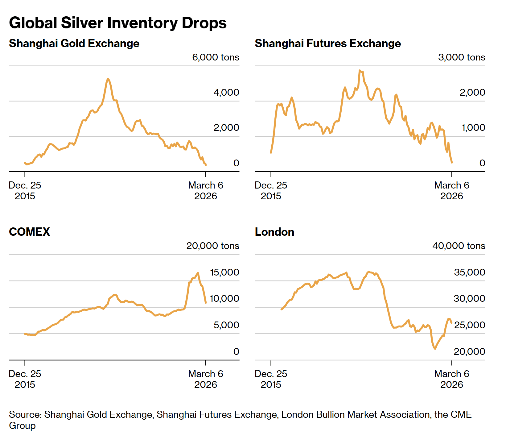 Bloomberg noted that “demand for physical [silver] bars is very strong, with retail investors and solar manufacturers driving consumption, and inventories in Chinese exchanges have been falling, having a psychological effect on the market.” According to Chinese customs data on Friday, China, which is the world’s biggest buyer of silver, pulled in over 790 tons in the first two months of ‘26, including nearly 470 tons in February, the highest ever for that month.