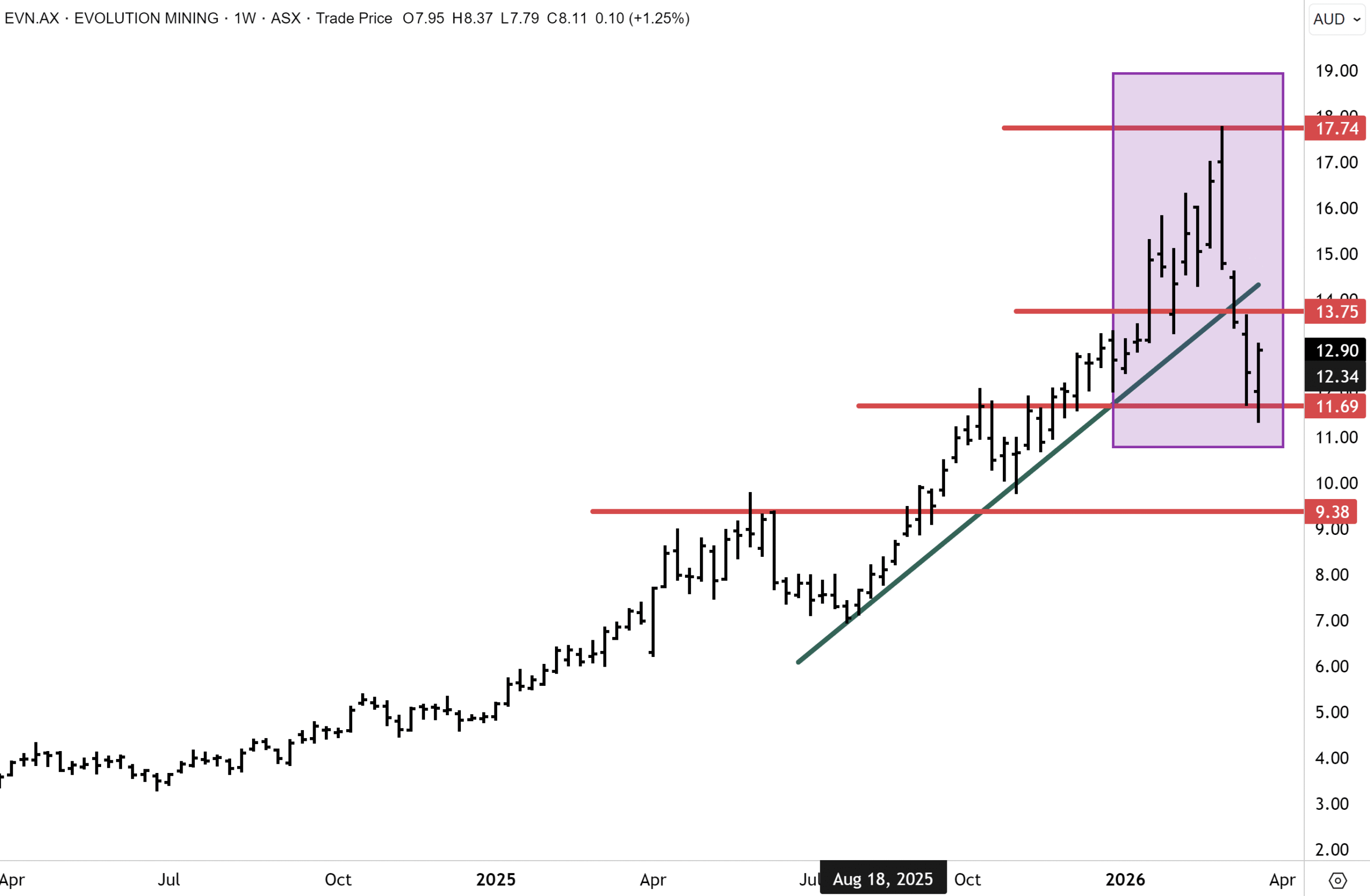 Evolution made a new record high near $18 just before the ME war on 28th February. The selloff has been severe in March, but in line with the “risk off” move in other gold stocks and the fall in the gold price. Evolution has retraced approximately half the advance from last July’s lows around $7, representing a 50% Fibonacci retracement. We expect support to emerge below $12 and for upward momentum to resume when risk appetite returns. If we are correct in spot gold having hit a major bottom during this correction, then EVN likely has also seen the lows during the incumbent selloff in financial markets. This is our base case. The next technical target for EVN to hurdle resides around $14, which we believe will be cleared on the topside in the coming months.