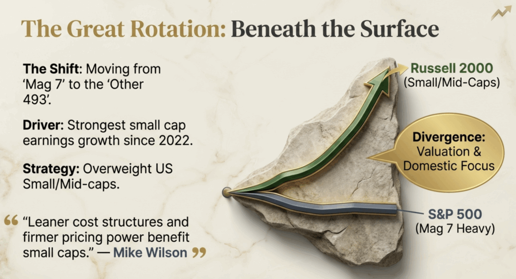 Mike Wilson wrote in his note this week that “small cap earnings growth is at its strongest level since 2022 (+8% Y/Y; up from -8% a year ago). Importantly, earnings revisions breadth versus large caps accelerated further last week as the group broke out of a multi-year relative performance downtrend. At the heart of this turn in fundamentals is the positive operating leverage dynamic …In short, leaner cost structures and firmer pricing power benefit small caps, in particular. In our view, this reinforces the idea that the relative strength in small caps since November is fundamentally driven, a setup we have not seen since the last time we were OW the group for a sustained period, between 2020 and early 2021.”