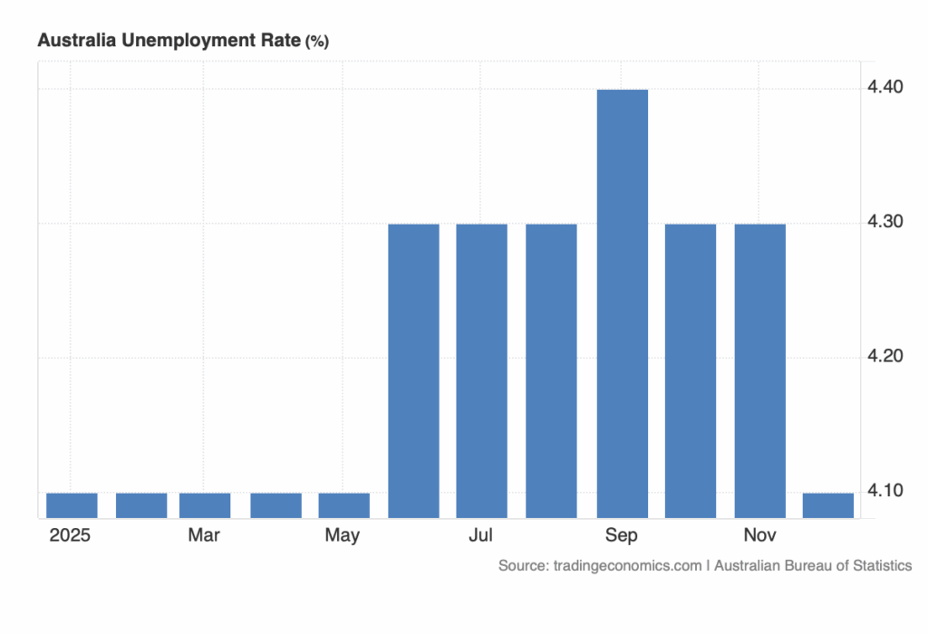 Back in Australia, the A$ soared Thursday on a strong jobs report – which effectively snuffs out the rate cut narrative this year – and could lead to hikes. The Australian dollar ripped to a fresh 15-month high at US68.4c after a blowout labour-market report forced traders to rapidly reprice the near-term path for the RBA. December unemployment fell to 4.1%, contrasting with the consensus call for a rise to 4.4%. Hiring also surprised sharply as the economy added 65,200 jobs, more than double the roughly 30,000 the market had pencilled in. The immediate market response saw bond traders lift the implied probability of a February rate hike to about 60%, up from around 30% before the data, and the broader curve now reflects two increases across 2026.