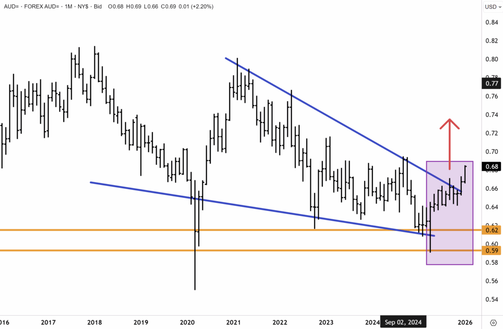 Meanwhile, the Aussie is also riding a powerful external tailwind, with booming metals and bulk commodities, plus softer sentiment toward the US dollar. Last year, I predicted the A$ would rise well into the mid-70c level in 2026 – which seems to be now playing out.