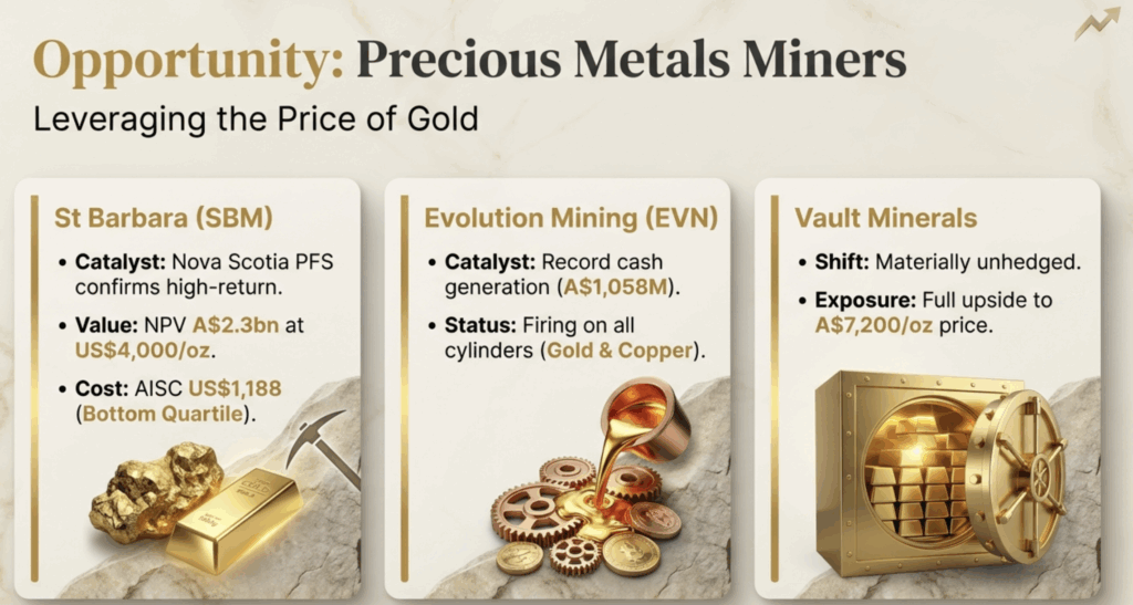 This week, we have seen several Australian gold miners report bumper numbers and other upbeat updates. Starring here was St Barbara, which surged +20% on Wednesday after releasing a well-received prefeasibility study (PFS) for its 15-Mile Processing Hub in Nova Scotia, Canada. The PFS confirmed the project as a high-return, capital-efficient gold operation with economics substantially enhanced by current gold prices exceeding US$4,800 per ounce – well above the US$3,000/oz assumption (base case and US$4,000/oz for the bull case) used in the study.