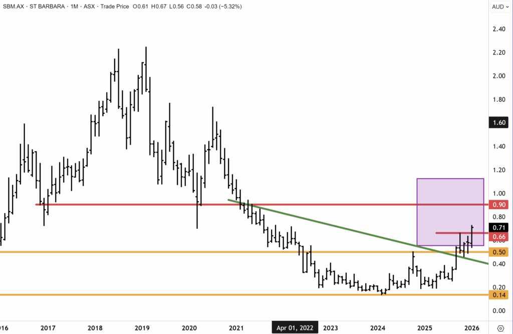 In our mid-December technical update, we said, “The upward dynamic in St Barbara yesterday likely marks the end of a recent consolidation since the shares traded at a three-year high near 68c and gold topped out at $4,500oz. We see upward momentum in SBM now resuming. A topside breakout above downtrend resistance, which intersects around 58c, would confirm an inflection. Our technical base case is for SBM to resume upward momentum towards the next key resistance cluster around 74c/90c. Greater recovery potential and technical upside reside over the coming year, in our opinion.”
