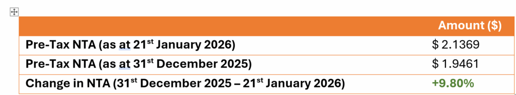 Finally, the Fat Prophets Global Contrarian Fund (ASX: FPC) updated the ASX this morning, which revealed a cracking start to the year. Estimated pre-tax NTA confirmed a month-to-date increase of nearly 10%. Performance was driven across the portfolio and notably in precious metals, Chinese tech majors and Japanese financials. FPC shares also made a new record high, touching $1.60 for the first time. On this front, the discount of share price below the underlying estimated pre-tax NTA remains a sizeable c26%.