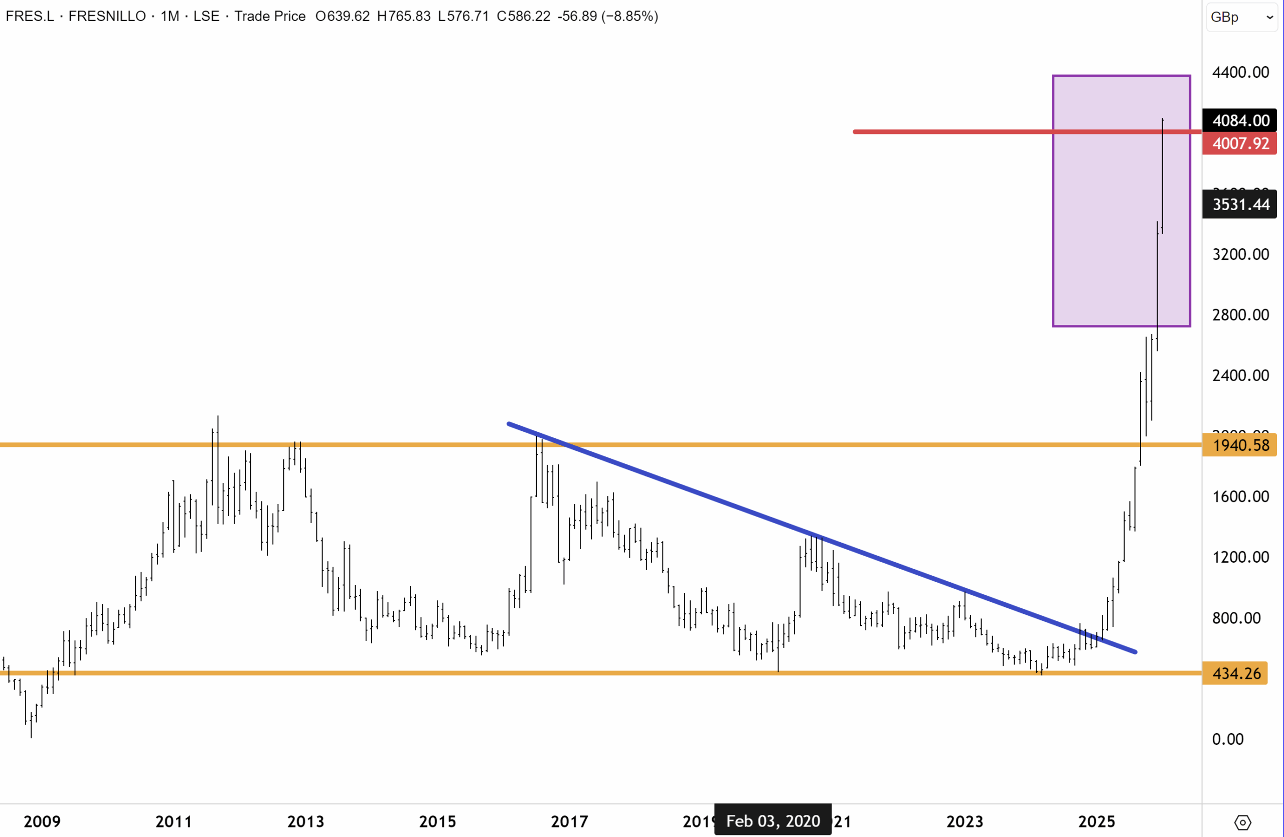 Fresnillo has certainly extended higher since our last technical update in early December, rising north of £40 this week. Fresnillo, on a twelve-month basis, retains its spot at the top of the FTSE100 table. The scope is open for further upside over the medium to longer term, given our bullish view on the silver price. However, we remain reticent on adding further exposure or buying at current prices, given the huge underlying move in the stock. There is a good chance that Fresnillo could now undergo a consolidation, which would be healthy. However, we remain committed to Fresnillo given our bullish view on silver (and gold). Silver spot prices could potentially rise much further this year.