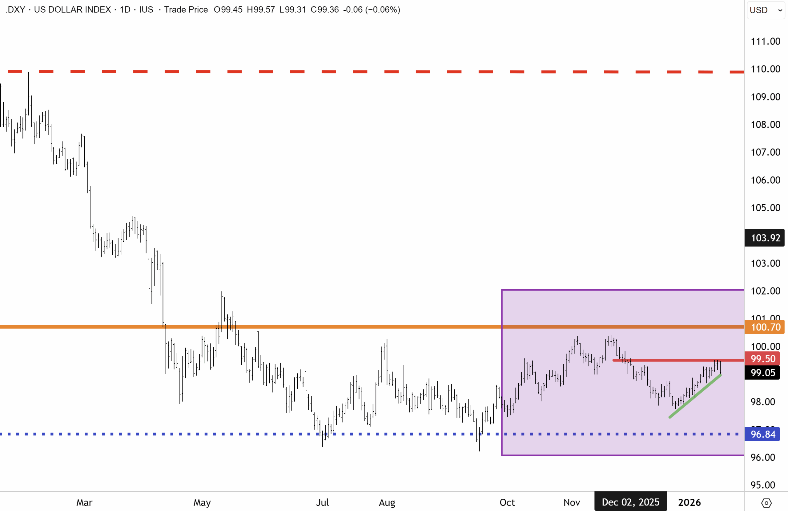 For now, the dollar index remains range-bound after bottoming out last year at 96.5. A breakout and exit on the topside of the range above 100 would be a bullish signal that upward momentum was resuming in the DXY. However, this is not our base case. We believe the DXY will soon resume downwards and that at some point this year, the big support level at 96.5 will be retested.