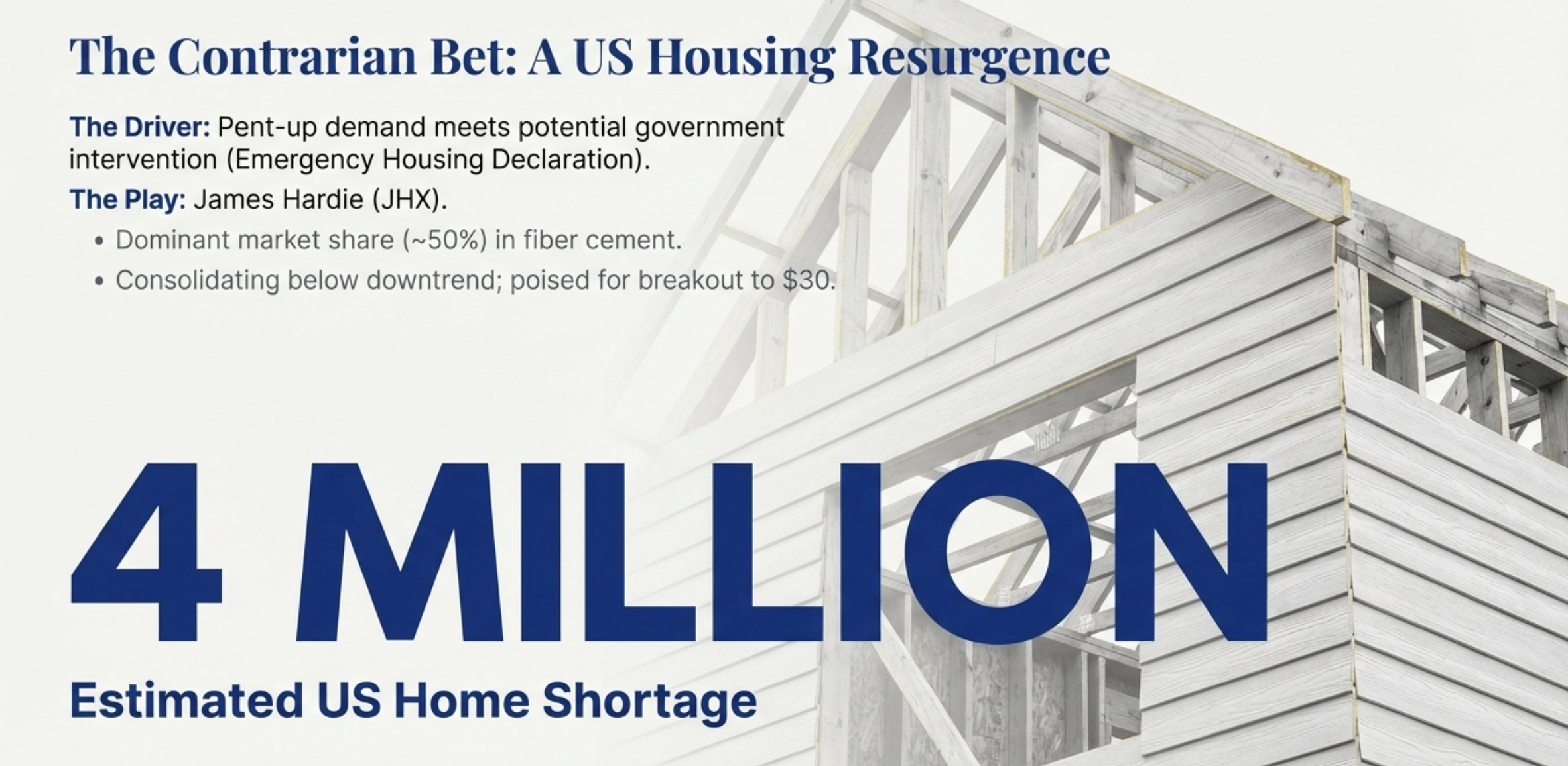 We are playing this theme via James Hardie, which declined over half from last year’s peak following a merger and after earnings came in lower than expectations. However, despite this, I believe there is significant recovery potential this year for James Hardie, which enjoys a dominant US market share position of around c45% in both fibre cement cladding and engineered timber decking. We hold James Hardie across all our Australian managed account portfolios and the Fat Prophets Global Contrarian Fund.