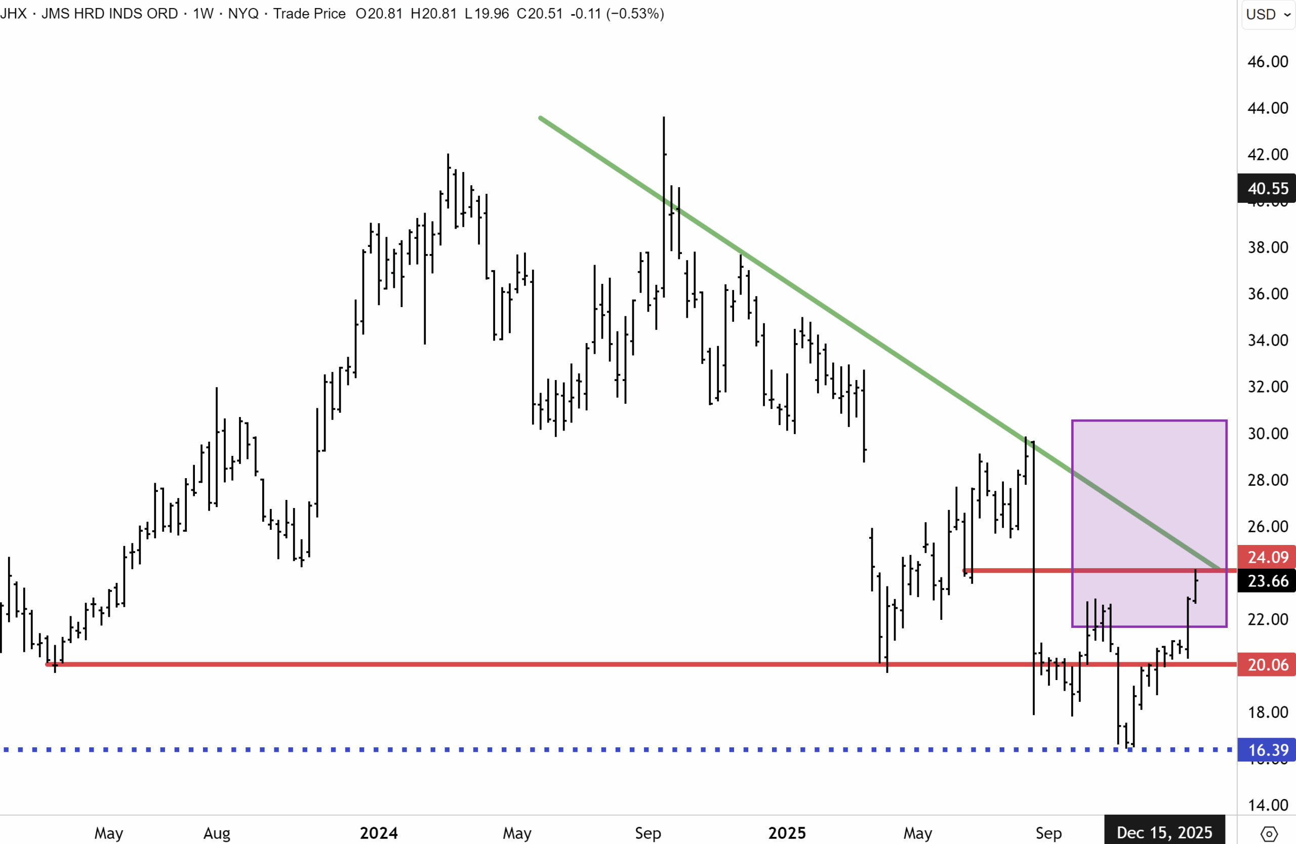 James Hardie ADRs (US: JHX) are presently consolidating below the downtrend, which now intersects at $24. We anticipate a breakout and exit from the downtrend in the coming months, which is our base case. Once a breakout has been sustained, we believe significant recovery potential will ensue for JHX over the course of this year.