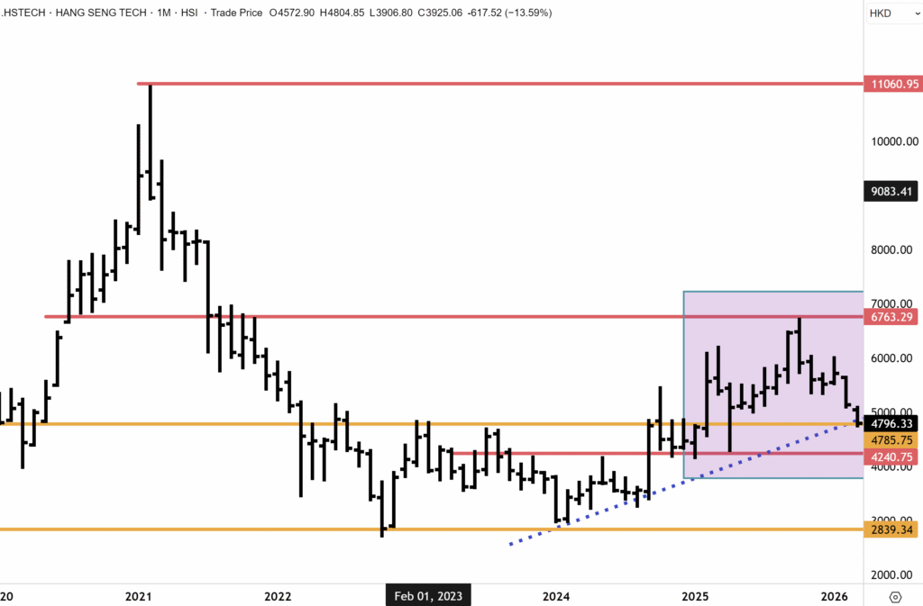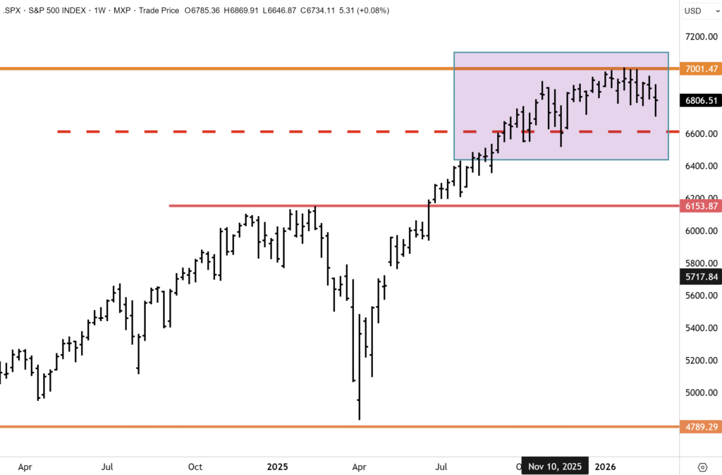 The S&P500 has yet to break below support at the bottom of the range near 6,600 and remains almost at the midpoint within the range that extends back to mid 2025.