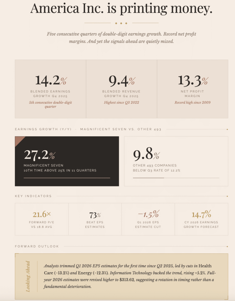 - US Q4 earnings season wrapped with 14.2% blended growth, record 13.3% net margins, and full-year 2026 EPS estimates raised.