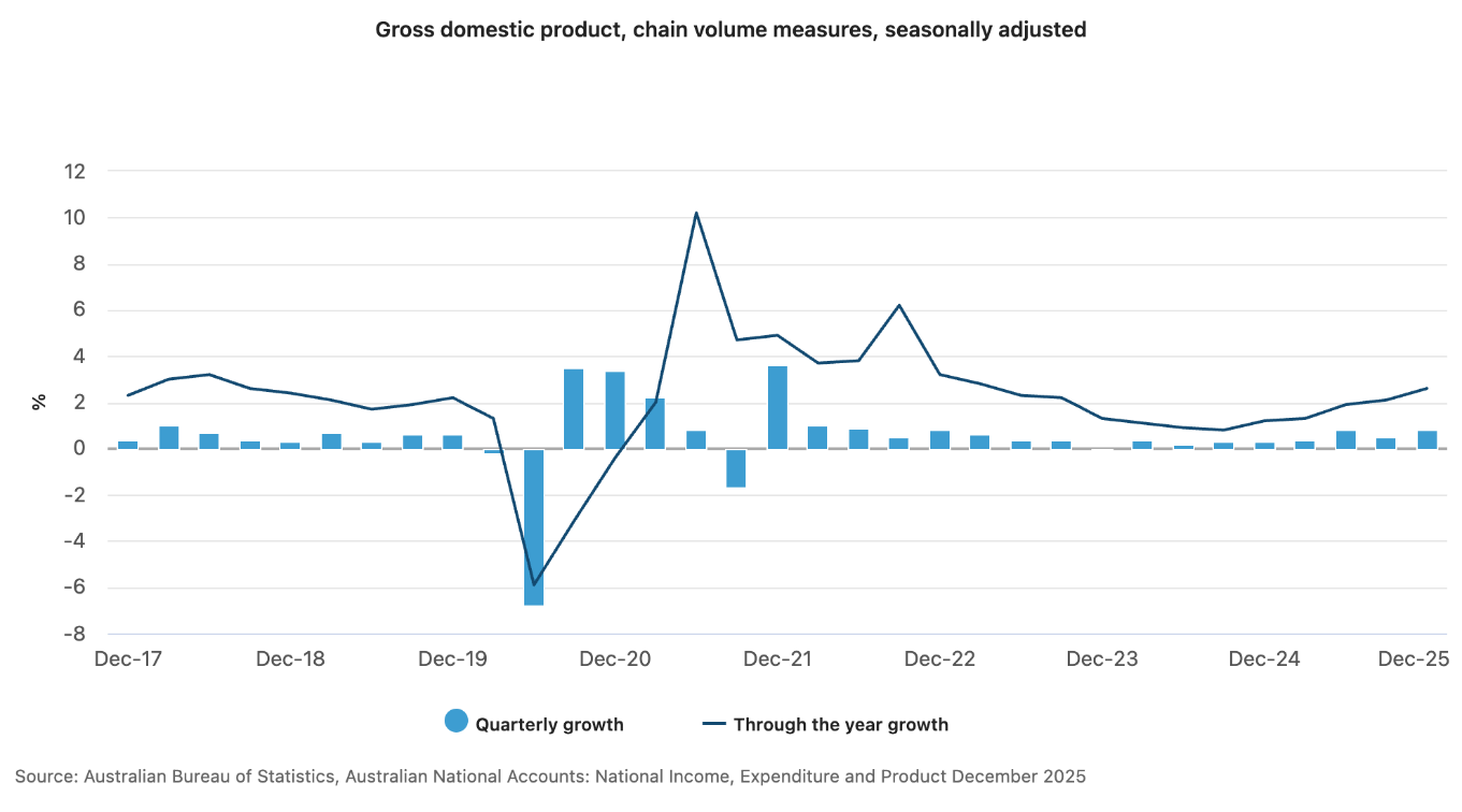 Australia’s economy expanded +0.8% in the December quarter, accelerating from an upwardly revised +0.5% in Q3 and marking the 17th consecutive quarter of growth. Annual GDP rose +2.6%, well above the +2.2% consensus forecast and the fastest yearly pace in nearly three years. The detail beneath the headline was broadly constructive.