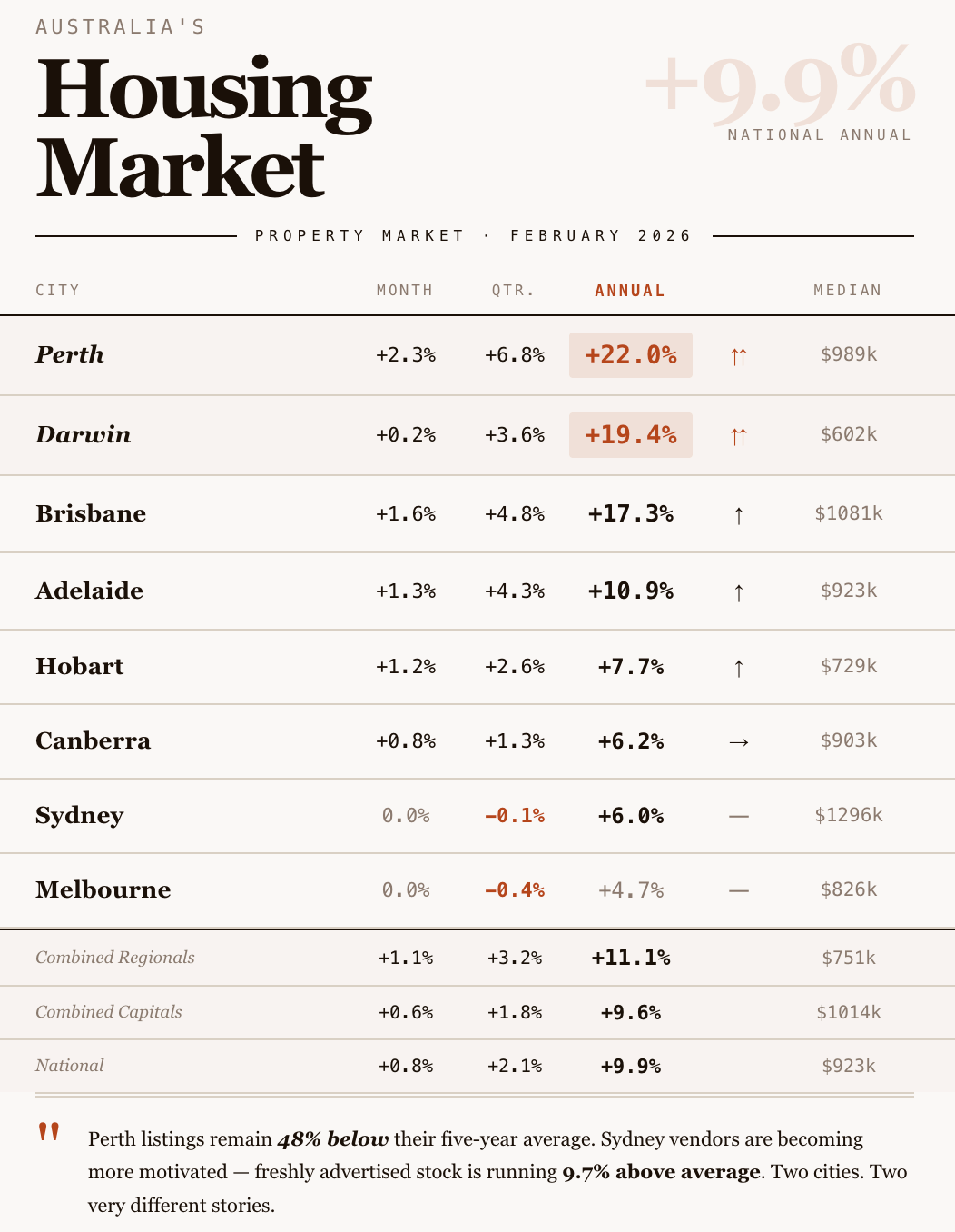 - Australia’s property market is running a two-speed story: Perth surged 2.3% in February (+22% annually) while Sydney was flat and Melbourne dipped.