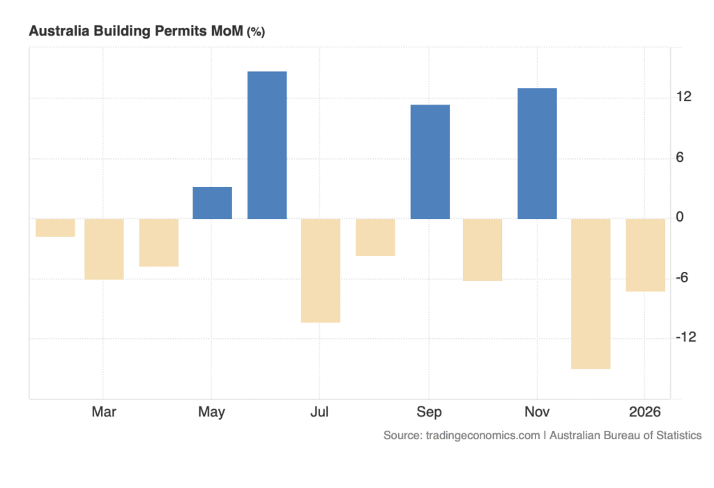 The weakness was concentrated in higher-density approvals, where private sector dwellings excluding houses fell 24.5%, while approvals for standalone houses continued to creep higher at +1.1%. The picture was uneven across state lines. Victoria shed -11.0% and South Australia -9.3%, while Western Australia bucked the trend with a 13.7% gain. On an annual basis, approvals are now down 15.7%, a data point that sits awkwardly alongside the RBA’s renewed hawkishness and those implications for the already-stretched construction pipeline.