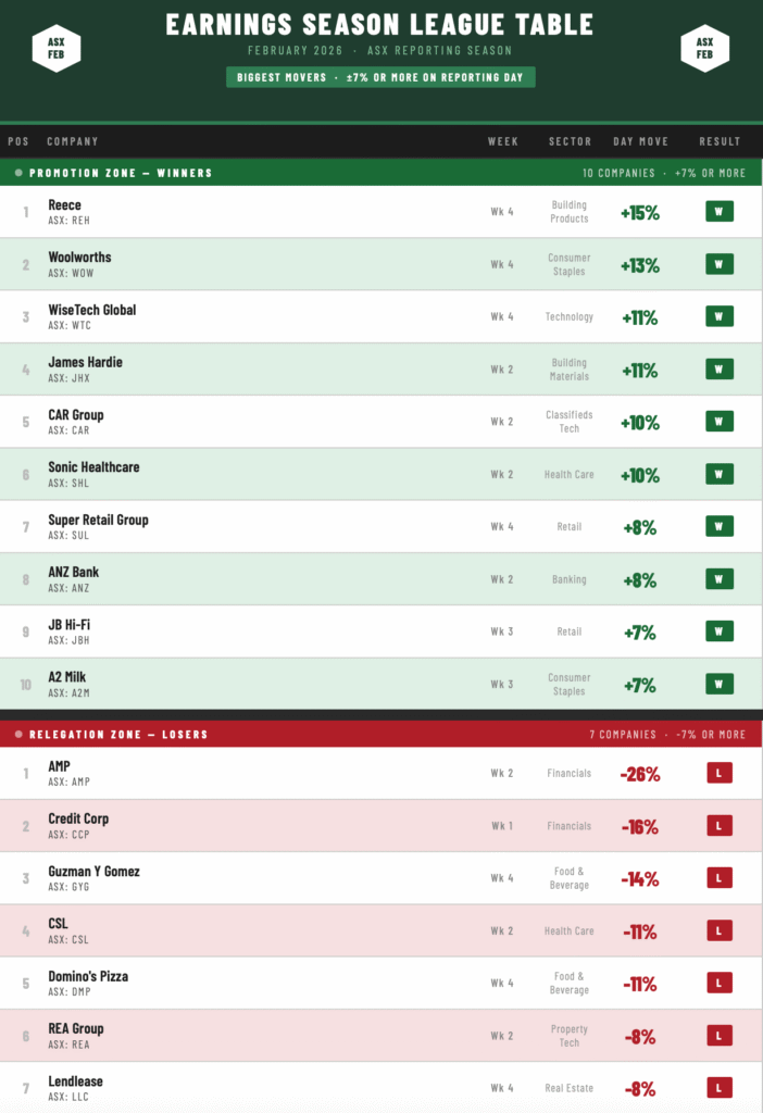 Talking about the signals underneath the noise, there were a few worth noting. The major banks reported solid to impressive results across the board. Loan growth is running ahead of system, net interest margins have stabilised, and cost discipline has improved materially. The banks posted a strong double-digit percentage gain in February, providing a broad-based lift to the ASX200. Below we have put together a ‘League Table’ of many of the biggest movers and shakers based on the move around the day their respective reports dropped. It isn’t comprehensive, and we used + or -7% as a cutoff. Look out for the research team’s post-match report on the February 2026 season, which contains a more comprehensive review.