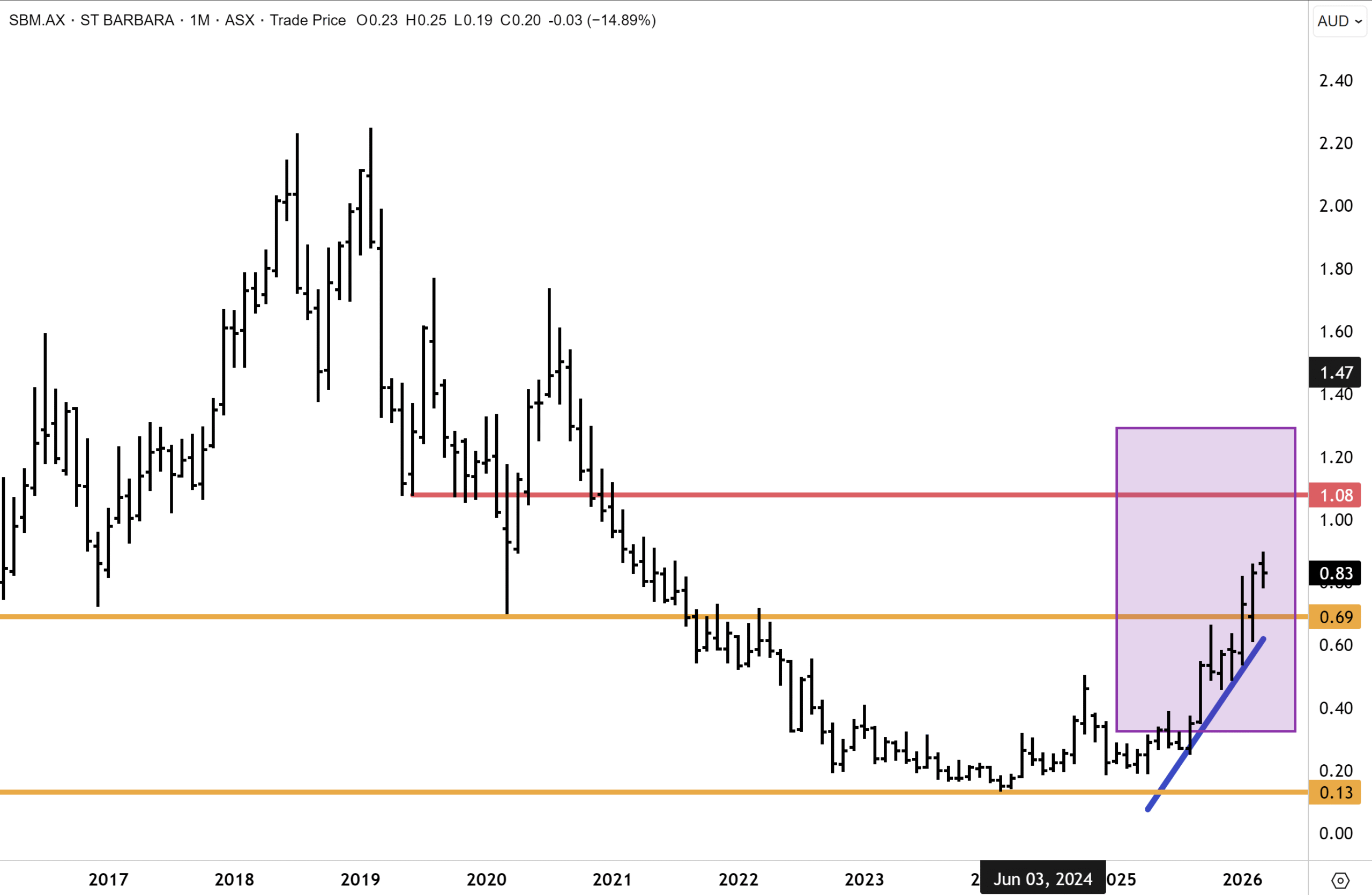 - St Barbara (ASX: SBM): Development play with two very valuable projects that are game changers that are on the go.