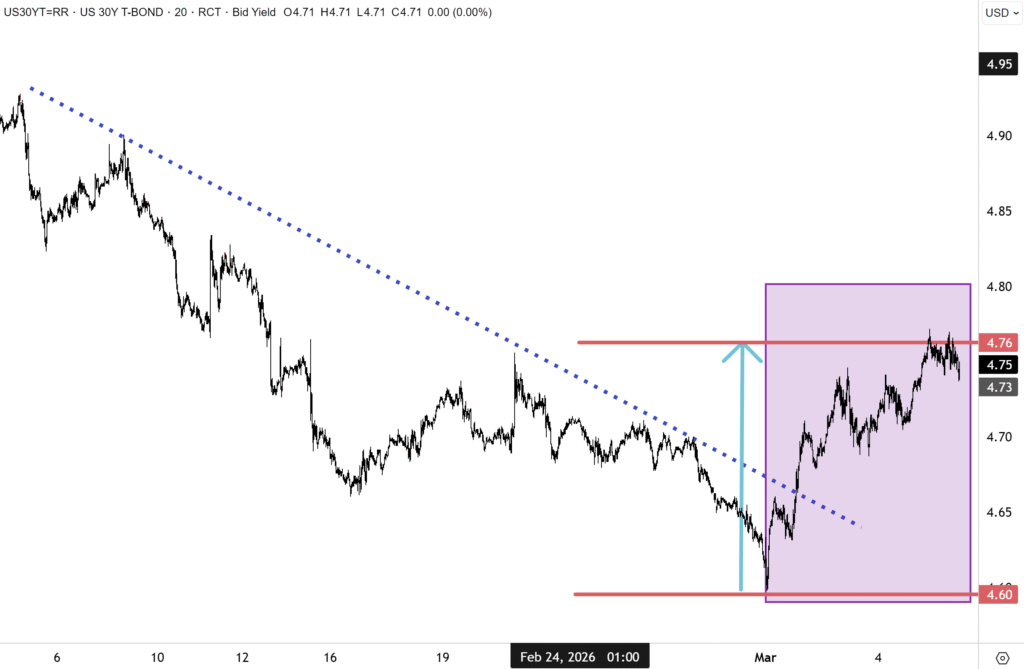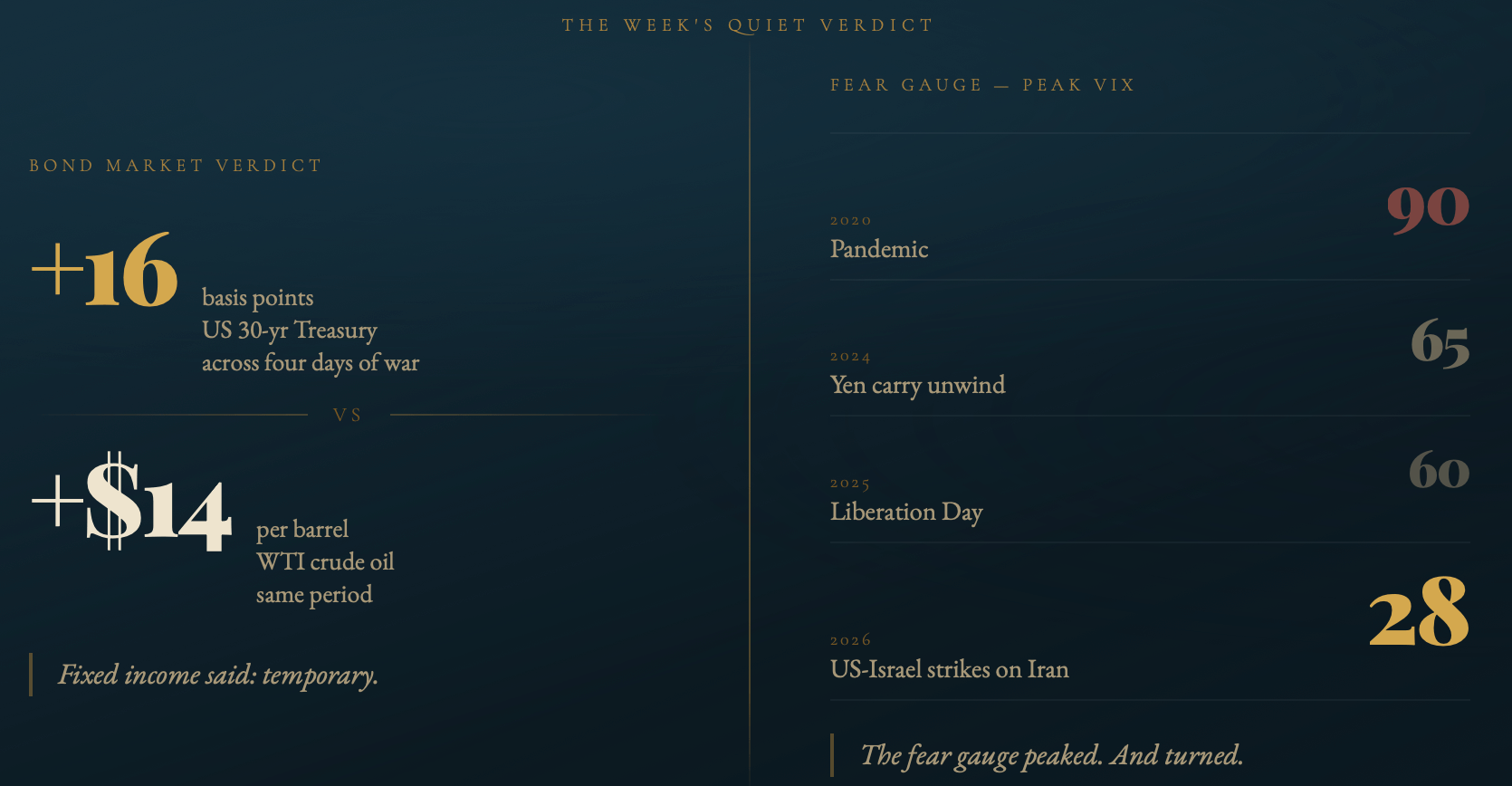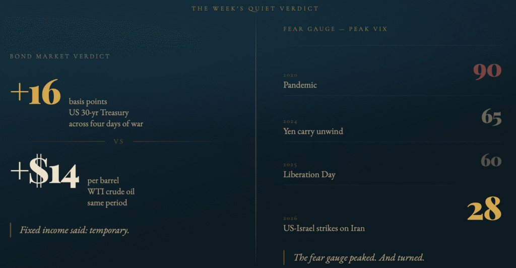 Markets spent four days deciding whether that scenario was plausible. Their conclusion, delivered through price action rather than proclamation, was that it wasn’t, at least not yet. The VIX peaked at 28 and retreated. The US 30-year Treasury added only 16 basis points across the entire week despite WTI surging $14 per barrel. Both signals say the same thing: temporary disruption, not structural rupture.