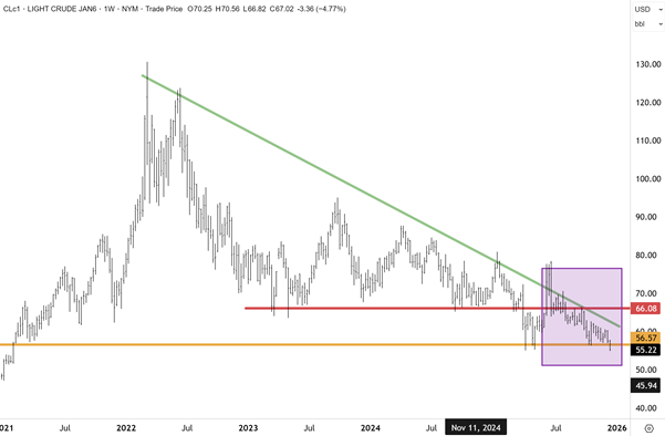 WTI crude oil has this week broken down below key support at $57 to mark a new four-year low at $56.50. Oil prices are resuming downward momentum and could now fall towards the low $50s. However, at this level, the pain threshold for most high-cost producers becomes acute.