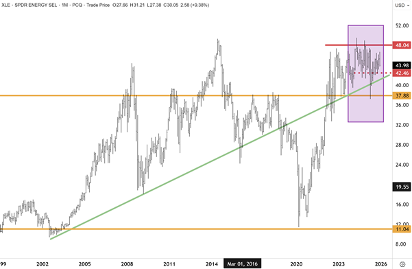 Yet despite what appears to be an overwhelming bear case for oil prices in 2026, the SPDR Energy ETF – US: XLE – (which is the largest exchange-traded fund of all the major US energy companies, including Exxon Mobil and Chevron) continues to hold up and is within a short distance from the record highs. This is perplexing given the ETF traded down to extreme levels during previous oil market downturns, including 2002, 2008 and during the pandemic (when oil prices briefly went negative).