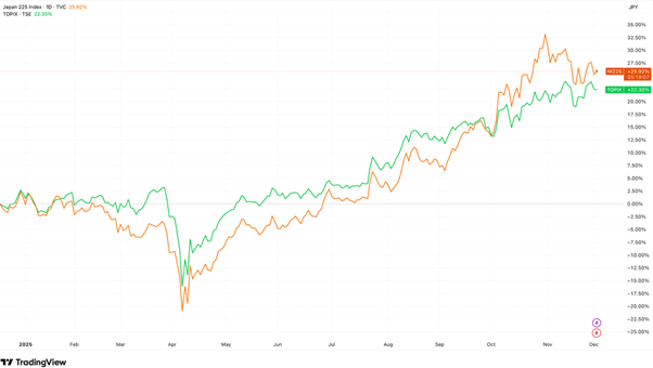 “The Japanese stock market has another solid year of returns, with the TOPIX and Nikkei making new record highs above 44,000 and 3,300, respectively. The yen appreciates against the US dollar as the ECB and Bank of England cut rates. After being the worst performer in recent years, the yen leads the rally amongst the major currencies.”