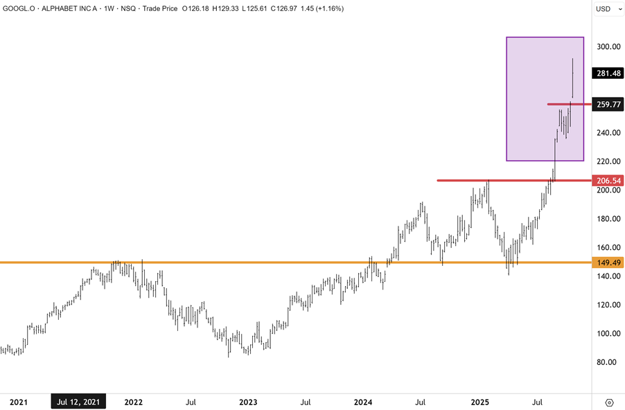 A week ago, when I provided an update on Google’s latest quantum computing breakthrough, I also updated our technical view, saying, “Alphabet has fully recovered from the correction earlier this year to make new record highs near $260. The scope is open for continued upward extension with support now well-defined at $205 and below. We hold Alphabet in our Global managed account portfolio.”
